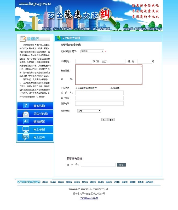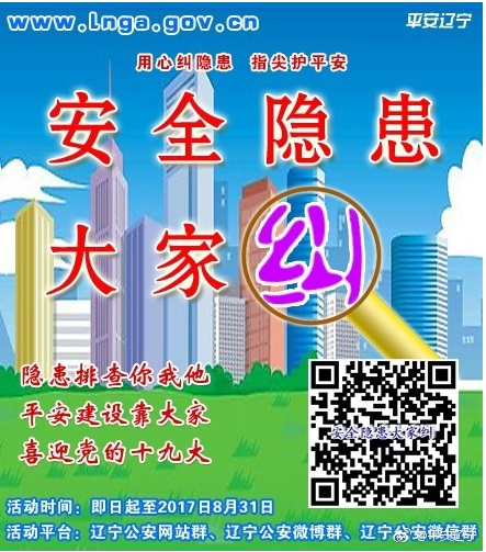 為深入貫徹落實習近平總書記系列重要講話精神,充分發(fā)揮全省“網(wǎng)上公安機關”平臺作用,遼寧省公安廳從即日起至8月31日,組織全省公安機關依托各級公安政務網(wǎng)站、公安政務微博、公安政務微信平臺,集中開展“安全隱患大家糾”活動,全面開啟遼寧公安“查患治患”工作的“互聯(lián)網(wǎng)+”模式。