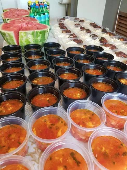 做好飯,就要忙著分盒飯,兩位大廚真是一點休息的時間都沒有。為了方便領(lǐng)取,兩位大廚從市場采購到專用飯盒,每次都精心包裝,水果、主食、菜品整齊有序擺放,像完成一件微雕工藝品那樣專注投入。