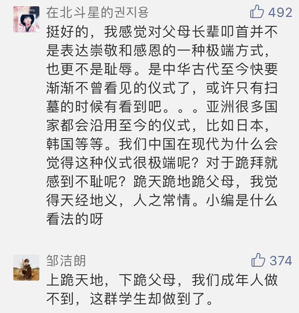 此類(lèi)“跪拜感恩儀式”此前也多次見(jiàn)諸媒體。有人認(rèn)為憑借“跪拜父母”這樣一個(gè)古樸而鄭重的形式,可以倡導(dǎo)日益淡薄的感恩文化回歸,也有網(wǎng)友認(rèn)為“孝道在心,不在做秀”,或從人格養(yǎng)成方面評(píng)論:“跪拜禮抹殺了獨(dú)立人格”。