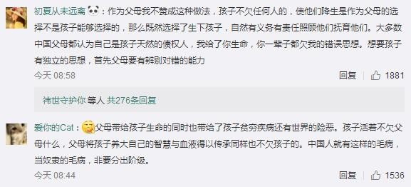 網(wǎng)友“兩點(diǎn)半加雞蛋小王子”:下跪磕頭代表的意義是服從,就是要求孩子乖乖聽(tīng)話(huà),不可忤逆,暗示孩子你們只是父母的一件所有物,抹殺了獨(dú)立人格的存在。