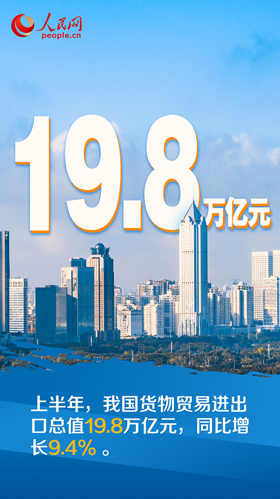 據(jù)海關(guān)統(tǒng)計(jì),今年上半年我國貨物貿(mào)易進(jìn)出口總值19.8萬億元,同比增長9.4%。其中,出口11.14萬億元,增長13.2%;進(jìn)口8.66萬億元,增長4.8%……上半年外貿(mào)進(jìn)出口“答卷”傳遞出我國經(jīng)濟(jì)持續(xù)恢復(fù)的積極信號(hào)。
