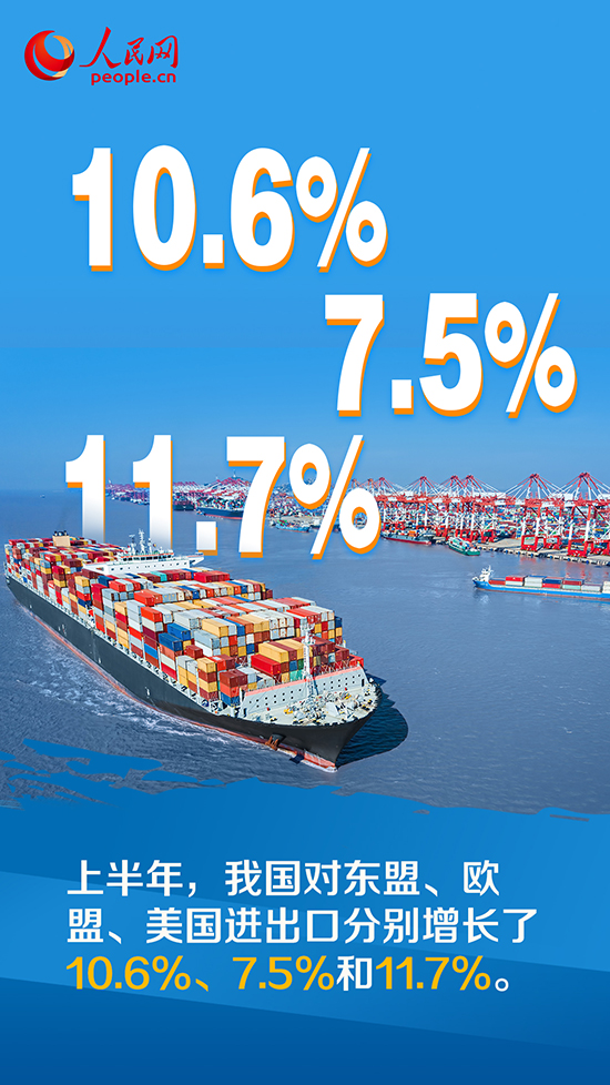上半年,我國對(duì)東盟、歐盟、美國進(jìn)出口分別增長了10.6%、7.5%和11.7%。同期,我國對(duì)“一帶一路”沿線國家、區(qū)域全面經(jīng)濟(jì)伙伴關(guān)系協(xié)定(RCEP)貿(mào)易伙伴進(jìn)出口分別增長17.8%和5.6%。