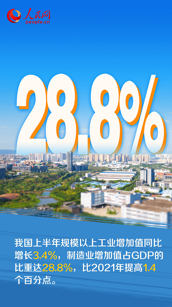 上半年,在各地區(qū)各部門共同努力下,盡管面臨疫情沖擊,產(chǎn)業(yè)鏈供應鏈日益穩(wěn)定暢通,工業(yè)經(jīng)濟迅速扭轉(zhuǎn)了下滑態(tài)勢,實現(xiàn)了恢復增長。國新辦7月19日舉行發(fā)布會介紹,今年上半年,我國規(guī)模以上工業(yè)增加值同比增長3.4%,規(guī)模以上制造業(yè)增加值同比增長2.8%,制造業(yè)增加值占GDP的比重達28.8%,比2021年提高1.4個百分點。